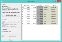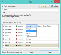 Orange correctly assumed that a column with gene names is meta information, which is displayed in the Data Table in columns shaded with light-brown. It has not guessed that function, the first non-meta column in our data file, is a class column. To correct this in Orange, we can adjust attribute role in the column display of File widget (below). Double-click the feature label in the function row and select target instead. This will set function attribute as our target (class) variable.