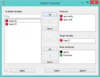 Opening Select Columns reveals Orange’s classification of attributes. We would like all of our continuous attributes to be data features, gene function to be our target variable and gene names considered as meta attributes. We can obtain this by dragging the attribute names around the boxes in Select Columns:
