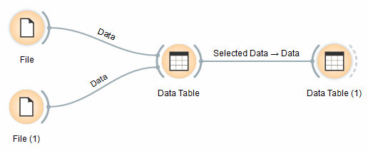Dalam workflow di bawah ini, kita menggunakan dua widget File untuk membaca dataset Iris dan Glass (disediakan dalam distribusi Orange), dan mengirimkannya ke widget Data Table.