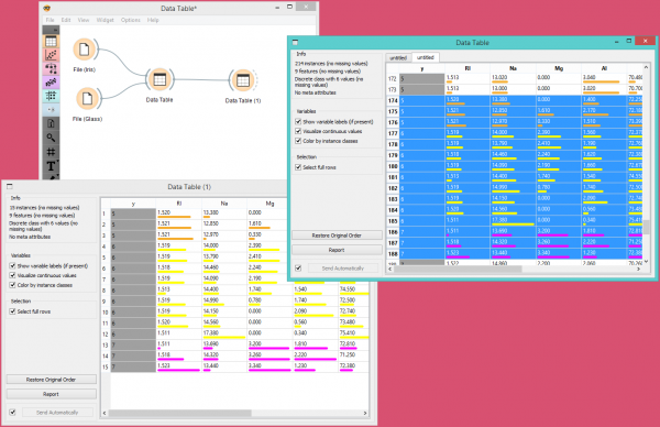 Contoh data yang dipilih dalam Widget Data Table pertama diteruskan ke Widget Data Table kedua. Perhatikan bahwa kita dapat memilih dataset mana yang akan dilihat (iris atau glass). Mengubah dari satu dataset ke yang lain mengubah pemilihan instance data yang dikomunikasikan jika Commit on any change dipilih.