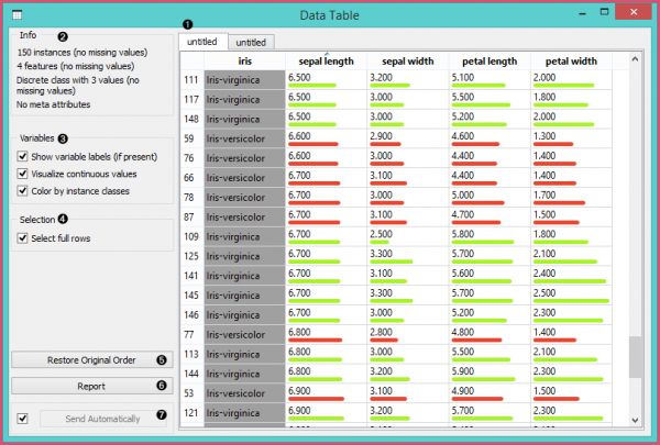 - The name of the dataset (usually the input data file). Data instances are in rows and their attribute values in columns. In this example, the dataset is sorted by the attribute “sepal length”.