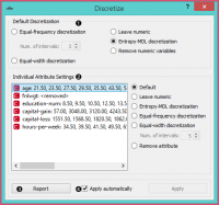 - Untuk memperlakukan atribut secara individual, buka Individual Attribute Settings. Ini akan menunjukkan diskritisasi spesifik dari setiap atribut dan memungkinkan perubahan. Pertama, daftar kiri atas menunjukkan titik cut-off untuk setiap atribut. Dalam snapshot, kita menggunakan entropy-MDL discretization, yang menentukan jumlah interval optimal secara otomatis; kita bisa melihatnya mendiskreditkan usia menjadi tujuh interval dengan cut-off di 21.50, 23.50, 27.50, 35.50, 43.50, 54.50 dan 61.50, sementara capital-gain dibagi menjadi banyak interval dengan beberapa cut-off. Final weight (fnlwgt), misalnya, dibiarkan dengan interval tunggal dan dengan demikian dihapus. Di sebelah kanan, kita dapat memilih metode diskritisasi khusus untuk setiap atribut. Atribut “fnlwgt” akan dihapus oleh MDL-based discretization, jadi untuk mencegahnya dihapus, kita memilih atribut dan memilih, misalnya, diskritisasi frekuensi sama. Kita juga dapat memilih untuk membiarkan atribut continuous..
