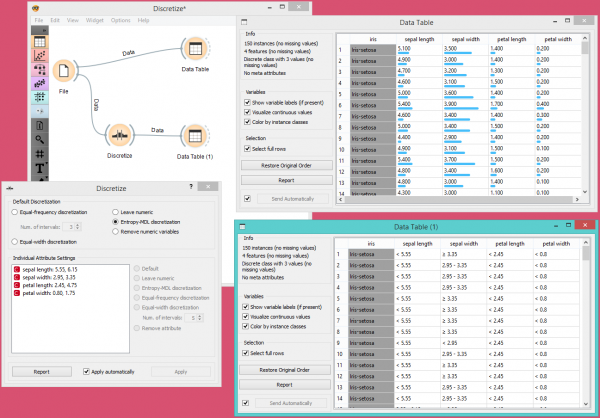 Dalam skema di bawah ini, kami menunjukkan dataset Iris dengan atribut kontinu (seperti dalam file data asli) pada widget Data Table dan yang dengan atribut yang diskritisasi oleh widget Discretize pada widget Data Table(1).