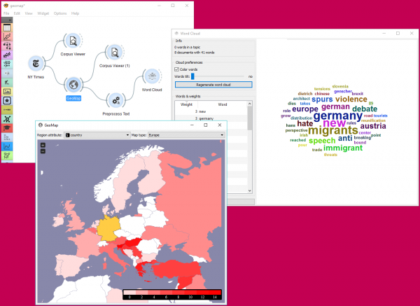 Kemudian kami mengirim data ke widget GeoMap untuk melihat distribusi atribut geolocations by country. Atribut tersebut sudah berisi tag negara untuk setiap artikel, itulah mengapa widget NY Times sangat bagus dalam kombinasi dengan widget GeoMap. Kita memilih Germany, yang mengirimkan semua dokumen yang ditandai dengan Germany ke output. Padahal, kita menanyakan widget NY Times untuk artikel di Slovenia, bukan Germany.