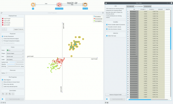 Widget Linear Projection menampilkan proyeksi linear class-labeled data. Ini mendukung berbagai jenis proyeksi seperti circular, linear discriminant analysis, principal component analysis, dan custom projection.