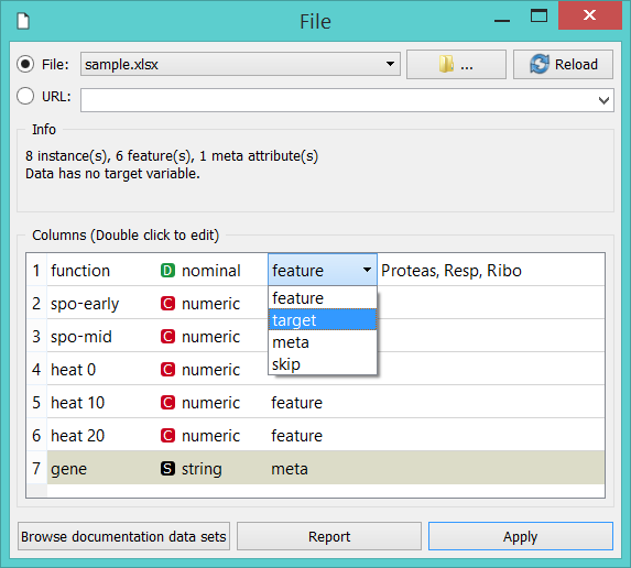 Orange dengan benar mengasumsikan bahwa kolom dengan nama gene dalam meta informasi, yang ditampilkan dalam Data Tabel dalam kolom yang diarsir dengan warna coklat muda. Disini belum di ketahui bahwa fungsi, kolom non-meta pertama dalam file data kita, adalah kolom class. Untuk memperbaikinya di Orange, kita dapat menyesuaikan atribut role di tampilan kolom File widget (di bawah). Double Klik label fitur di baris fungsi dan pilih target sebagai gantinya. Ini akan menetapkan atribut fungsi sebagai variabel target (class) kita.
