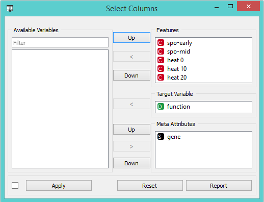 Membuka Select Columns akan memperlihatkan klasifikasi atribut Orange. Kita ingin semua atribut continuous menjadi fitur data, fungsi gene menjadi variabel target dan nama gene yang dianggap sebagai atribut meta. Kami dapat memperoleh ini dengan men-drag nama atribut di kotak di Select Columns: