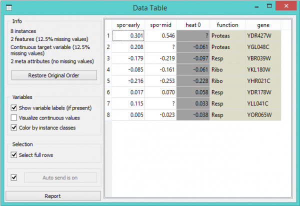 File berisi sebuah baris header, delapan instance data (baris) dan tujuh atribut data (kolom). Sel kosong dalam tabel menunjukkan entri data yang hilang. Baris mewakili gene; function (class) disediakan di kolom pertama dan name mereka di kolom kedua. Kolom yang tersisa menyimpan pengukuran yang mencirikan setiap gene. Dengan data ini, kita dapat, katakanlah, mengembangkan classifier yang akan memprediksi function gene dari pengukuran karakteristiknya.