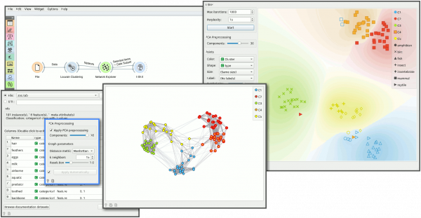 Widget Louvain Clustering mengkonversi dataset menjadi graph, dimana widget Louvain Clustering akan menemukan highly interconnected node. Kita bisa memvisualisasi graph yang dihasilkan menggunakan Widget Network Explorer dari Network addon.