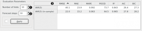 Time series: Time series as output by As Timeseries widget. Time series model(s): The time series model(s) to evaluate (e.g. VAR or ARIMA).