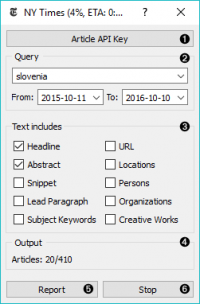 NYTimes is a data retrieving widget, similar to Twitter and Wikipedia. As it can retrieve geolocations, that is geographical locations the article mentions, it is great in combination with Document Map widget.