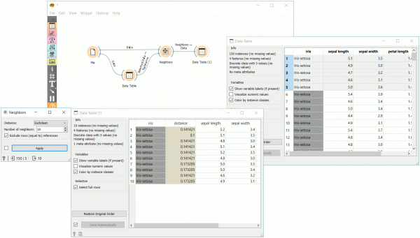 Pada contoh ini, kita menggunakan data iris dan meneruskannya ke widget Neighbors dan widget Data Table. Dalam widget Data Table, kita memilih contoh iris, yang akan berfungsi sebagai referensi kita, artinya kita ingin mengambil 10 contoh terdekat ke instance data terpilih. Kita menghubungkan widget Data Table ke widget Neighbors juga.