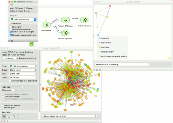 Kemudian kita menggunakan widget Network of Groups untuk mengelompokan (group) dari network berdasarkan atribut FAA Classification. Semua node dengan nilai yang atribut yang sama akan di representasikan dengan single node di output. Akan ada edge antars dua (2) node, jika mereka berbagi connection di network original.
