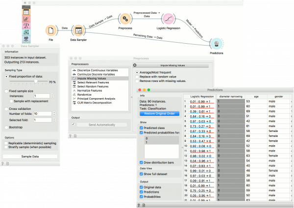 Pada contoh berikut ini, kita telah menggunakan dataset heart_disease.tab yang tersedia di dropdown menu dari widget File. Kemudian, kita menggunakan widget Preprocess untuk memasukkan nilai yang hilang dan menormalkan feature. Kita bisa mengamati perubahan yang terjadi di widget Data Table dan membandingkannya dengan data yang tidak diproses.