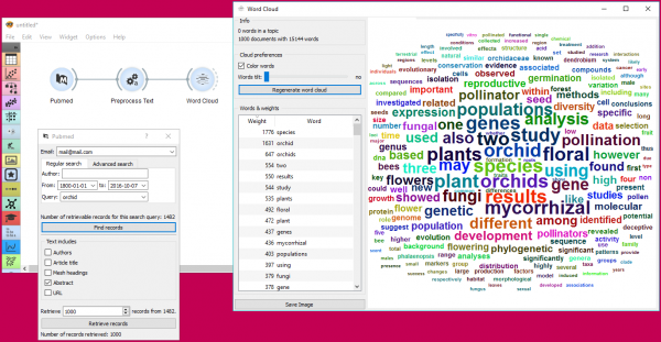 Widget PubMed dapat digunakan sama seperti widget data lainnya. Dalam contoh ini kita telah menanyakan database untuk record tentang anggrek (orchid). Kita mengambil 1000 record dan hanya menyimpan 'abstract' di fitur meta untuk membatasi pembuatan token hanya untuk fitur ini.