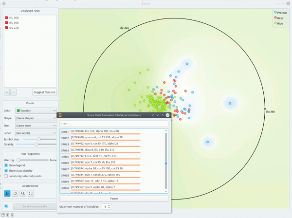 Sama seperti semua visualisasi berbasis poin, widget RadViz mencakup tool untuk intelligent data visualization (VizRank, lihat Leban et al. 2006) dan interface untuk explorative data analysis - pemilihan titik data dalam visualisasi. Sama seperti widget Scatter Plot, widget RadViz dapat digunakan untuk menemukan satu set variabel yang akan menghasilkan visualisasi yang menarik. Grafik Radviz di atas sesuai dengan definisi ini contoh dari visualisasi yang sangat baik, sedangkan yang di bawah ini - di mana kami menunjukkan interface VizRank (tombol Suggest feature) dengan daftar visualisasi 3-atribut dan nilainya - tidak semenarik gambar di atas.