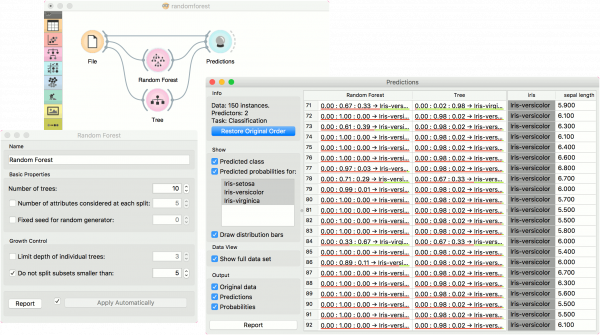 Untuk contoh classification task, kita menggunakan dataset iris. Menghubungkan Widget Random Forest ke Widget Predictions. Dengan menghubungkan Widget File ke Widget Random Forest dan Widget Tree dan hubungkan mereka ke Widget Predictions. Akhirnya, kita bisa memperhatikan prediksi dari ke dua model.