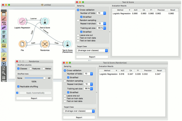 Dalam contoh berikut, diperlihatkan bahwa pengocokan nilai class mempengaruhi kinerja model. Walaupun menggunakan dataset yang sama, kinerja learner akan berbeda untuk data yang tidak melalui widget Randomize dan yang melalui widget Randomize.