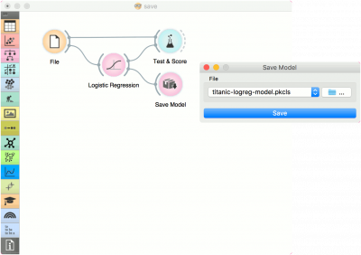 Saat kita ingin menyimpan model yang di set khusus, masukkan data ke model (mis. Logistic Regression) dan connect ke widget Save Model. Beri nama model; load ke workflow dengan widget Load Model. Dataset yang digunakan dengan widget Load Model harus mengandung atribut yang kompatibel.
