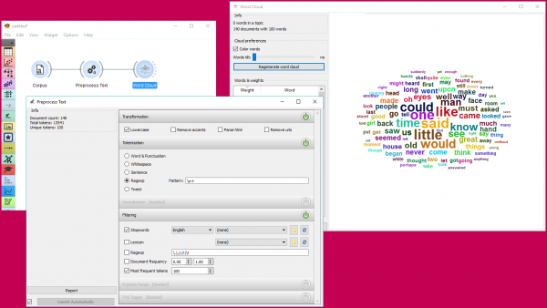 Dalam contoh ini, kita akan mengamati efek preprocessing pada teks. Kita bekerja dengan book-excerpts.tab yang kita load dengan widget Corpus. Hubungkan widget Preprocess Text ke widget Corpus dan mempertahankan metode preprocessing default (huruf kecil, tokenization per kata, dan penghapusan stopword). Satu-satunya parameter tambahan yang kita tambahkan sebagai keluaran hanya 100 token paling sering pertama. Kemudian kita menghubungkan widget Preprocess Text dengan widget Word Cloud untuk mengamati kata-kata yang paling sering ada dalam teks. Bermain-main dengan parameter yang berbeda, untuk melihat bagaimana mereka mengubah output.