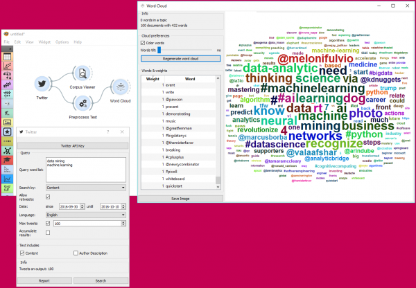 Pertama-tama, kita cek output menggunakan widget Corpus Viewer untuk memperoleh gambaran tentang hasil yang kita peroleh. Kemudian, menggunakan widget Preprocess Text di process tweet agar menjadi lowercase, url removal, tweet tokenizer dan membuang stopword dan punctuation. Cara terbaik untuk melihat hasilnya adalah menggunakan widget Word Cloud. Widget Word Cloud akan menampilkan kata yang paling populer di bidang data mining dan machine learning dalam dua minggu terakhir.