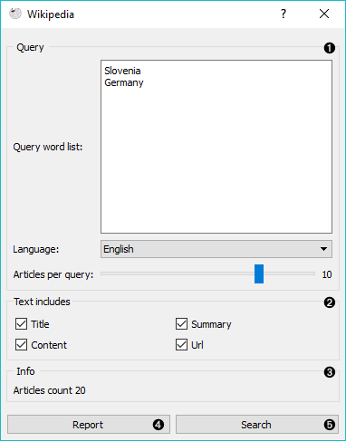 - Number of articles to retrieve per query (range 1-25). Please note that querying is done recursively and that disambiguations are also retrieved, sometimes resulting in a larger number of queries than set on the slider.