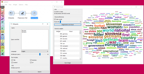 Dalam workflow sederhana berikut, kita menggunakan widget Wikipedia dan menggambil tulisan tentang ‘Slovenia’ dan ‘Germany’. Kemudian, melakukan preprocessing menggunakan widget Preprocess Text dan mengamati kata yang paling sering muncul dalam tulisan-tulisan tersebut menggunakan widget Word Cloud.