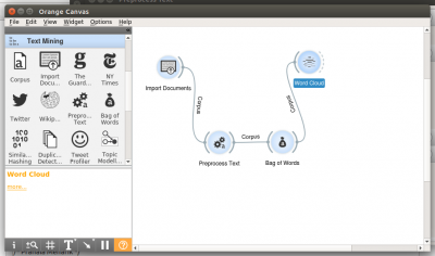 Word Cloud dapat di bangun dari Dokumen yang kita miliki. Di toolbox text mining telah tersedia widget Import Documents untuk membaca file dokumen. Sebelum di tampilkan sebagai word cloud ada baiknya dilewatkan ke widget Preprocess Text terlebih dulu, untuk mengurangi berbagai kata yang tidak dibutuhkan, seperti kata penghubungi dll. Selanjutnya kita dapat lewatkan ke widget Bag of Words terlebih dulu, atau langsung ke widget Word Cloud untuk menampilkan.