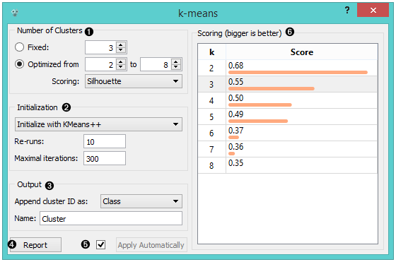 • Optimized: widget shows clustering scores for the selected cluster range: