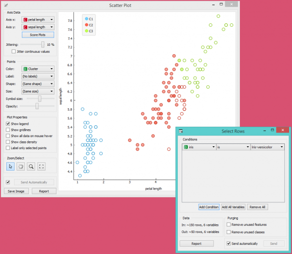 Yang kita akan benar-benar tertarik adalah seberapa baik cluster yang dilakukan oleh (unsupervised) clustering algorithm cocok dengan class aktual dalam data. Oleh karena itu, kita menggunakan widget Select Rows, di mana kami dapat memilih class-class individual dan menandai titik-titik terkait di widget Scatter Plot. Kecocokan yang sempurna terjadi pada setosa, dan cukup bagus untuk dua class lainnya.