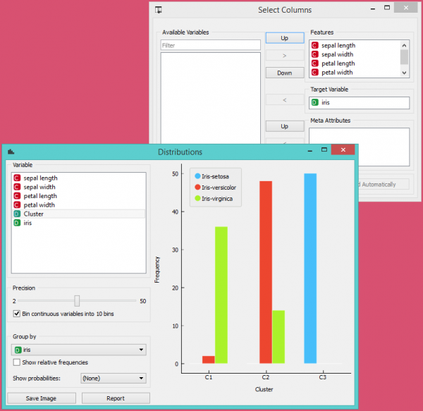 Mungkin cara yang lebih sederhana untuk menguji kecocokan antara cluster dan class original adalah dengan menggunakan widget Distributions.