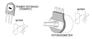 Nilai resistansi resistor jenis ini dapat diatur dengan tangan, bila pengaturan dapat dilakukan setiap saat oleh operator (ada tombol pengatur) dinamakan potensiometer dan apabila pengaturan dilakukan dengan obeng dinamakan trimmer potensiometer (trimpot). Tahanan dalam potensiometer dapat dibuat dari bahan carbon dan ada juga dibuat dari gulungan kawat yang disebut potensiometer wirewound. Untuk digunakan pada voltage yang tinggi biasanya lebih disukai jenis wirewound.
