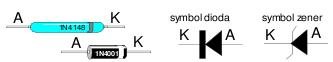 Ujung badan dioda biasanya diberi bertanda, berupa gelang atau berupa titik, yang menandakan letak katoda.