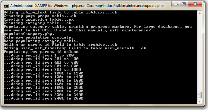 - 7. Setelah itu silakan masuk ke command line.. kemudian ketik "cd C:\xampp\php\" lalu tekan ENTER. setelah masuk di didirektori C:\xampp\php> ketikkan "php.exe C:\xampp\htdocs\wiki\maintenance\update.php"