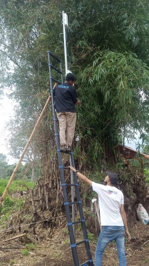 Jika kita membayangkan kabel fiber di sambungkan menggunakan tiang telekomunikasi atau tiang listrik, tampaknya kita tidak boleh terlalu optimis. Pada gambar di perlihatkan salah seorang teknisi dari SALMA.NET.ID sedang berjuang untuk menarik kabel fiber optik melalui pohon sebagai yang digunakan sebagai “tower”.