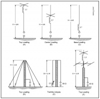 Gambar diatas memperlihatkan beberapa kemungkinan praktikal untuk membangun sebuah antena vertikal pendek, kita akan membahas tipe A, B dan C saja, tipe selebihnya diserahkan kepada anda untuk mengeksplore sendiri.