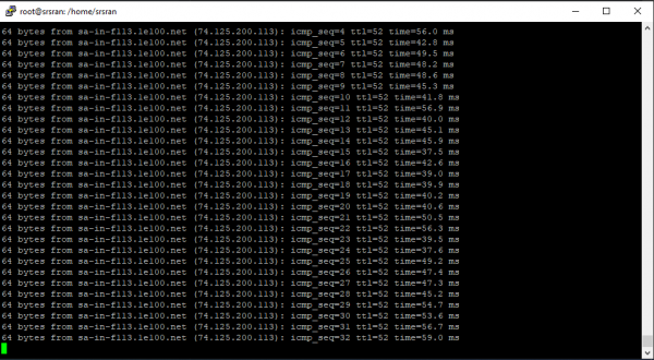 root@srsran:/usr/local/src/srsRAN/srsue# ping google.com 64 bytes from sa-in-fl13.1e100.net (74.125.200.113): icmp_seq=4 ttl=52 time=56.0 ms 64 bytes from sa-in-f113.1e100.net (74.125.200.113): icmp_seq=5 ttl=52 time=42.8 ms 64 bytes from sa-in-f113.1e100.net (74.125.200.113): icmp_seq=6 ttl=52 time=49.5 ms 64 bytes from sa-in-f113.1e100.net (74.125.200.113): icmp_seq=1 ttl=52 time=48.2 ms 64 bytes from sa-in-f113.1e100.net (74.125.200.113): icmp_seq=8 ttl=52 time=48.6 ms 64 bytes from sa-in-f113.1e100.net (74.125.200.113): icmp_seq=9 ttl=52 time=45.3 ms 64 bytes from sa-in-f113.1e100.net (74.125.200.113): icmp_seq=10 ttl=52 time=41.8 ms 64 bytes from sa-in-f113.1e100.net (74.125.200.113): icmp_seq=11 ttl=52 time=56.9 ms 64 bytes from sa-in-f113.1e100.net (74.125.200.113): icmp_seq=12 ttl=52 time=40.0 ms 64 bytes from sa-in-f113.1e100.net (74.125.200.113): icmp_seq=13 ttl=52 time=45.1 ms 64 bytes from sa-in-f113.1e100.net (74.125.200.113): icmp_seq=14 ttl=52 time=45.9 ms 64 bytes from sa-in-f113.1e100.net (74.125.200.113): icmp_seq=15 ttl=52 time=37.5 ms 64 bytes from sa-in-f113.1e100.net (74.125.200.113): icmp_seq=16 ttl=52 time=42.6 ms