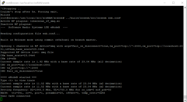 CStopping .. Couldn't stop after 5s. Forcing exit. Killed root@srsran:/usr/local/src/srsRAN/srsenb# ../build/srsenb/src/srsenb enb.conf Active RF plugins: libsrsran_rf_zmq.so Inactive RF plugins: --- Software Radio Systems LTE eNodeB --- Reading configuration file enb.conf... Built in Release mode using commit ce8a3cael on branch master. Opening i channels in RF device=zmq with args=fail on disconnect=true, tx port=tcp://*:2000, rx port=tcp://localhost:20 01, id=enb, base_srate=23.046 Supported RF device list: zmg file CHx base_srate=23.046 CHx id=enb Current sample rate is 1.92 MHz with a base rate of 23.04 MHz (x12 decimation) CH0 rx_port=tcp://localhost:2001 CH0 từ port=tcp://*:2000 CH0 fail_on_disconnect=true ==== eNodeB started === Type <t> to view trace Current sample rate is 11.52 MHz with a base rate of 23.04 MHz (x2 decimation) Current sample rate is 11.52 MHz with a base rate of 23.04 MHz (x2 decimation) Setting frequency: DL=1845.0 Mhz, UL=1750.0 MHz for cc_idx=0 nof_prb=50 RACH: tti=341, cc=0, pci-i, preamble=20, offset=0, temp_crnti=0x46 User Ox46 connected