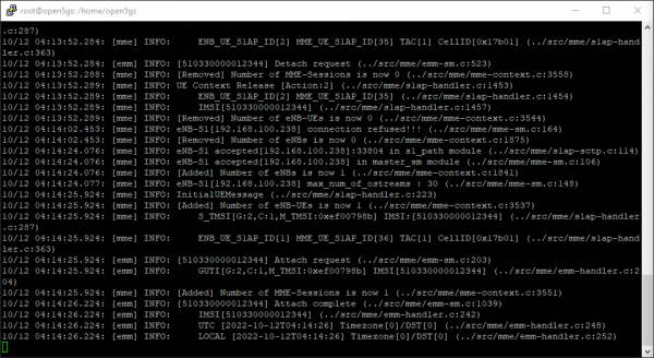 10/12 04:13:52.284: [mme] INFO: ENB_UE_S1AP_ID [2] MME_UE_S1AP_ID [35] TAC [1] CellID [0x17b01] (../src/mme/slap-handler.c:363) 10/12 04:13:52.284: [emm] INFO: [510330000012344] Detach request (../src/mme/emm-sm.c:523) 10/12 04:13:52.288: [mme] INFO: [Removed] Number of MME-Sessions is now 0 (../src/mme/mme-context.c:3558) 10/12 04:13:52.289: [mme] INFO: UE Context Release [Action:2] (../src/mme/slap-handler.c:1453) 10/12 04:13:52.289: [mme] INFO: ENB_UE_S1AP_ID[2] MME_UE_S1AP_ID[35] (../src/mme/slap-handler.c:1454) 10/12 04:13:52.289: [mme] INFO: IMSI: [510330000012344] (../src/mme/slap-handler.c:1457) 10/12 04:13:52.289: [mme] INFO: [Removed] Number of eNB-UEs is now 0 (../src/mme/mme-context.c:3544) 10/12 04:14:02.453: [mme] INFO: eNB-S1 [192.168.100.238] connection refused!!! (../src/mme/mme-sm.c:164) 10/12 04:14:02.453: [mme] INFO: [Removed] Number of eNBs is now 0 (../src/mme/mme-context.c:1875) 10/12 04:14:24.076: [mme] INFO: eNB-S1 accepted [192.168.100.238]: 33804 in sl_path module (../src/mme/slap-sctp.c:114) 10/12 04:14:24.076: [mme] INFO: eNB-51 accepted [192.168.100.238] in master_sm module (../src/mme/mme-sm.c:106) 10/12 04:14:24.076: [mme] INFO: [Added] Number of eNBs is now 1 (../src/mme/mme-context.c:1841) 10/12 04:14:24.077: [mme] INFO: eNB-S1 [192.168.100.238] max_num_of_ostreams : 30 (../src/mme/mme-sm.c:148) 10/12 04:14:25.924: [mme] INFO: InitialUEMessage (../src/mme/slap-handler.c:223) 10/12 04:14:25.924: [mme] INFO: [Added] Number of eNB-UEs is now 1 (../src/mme/mme-context.c:3537) 10/12 04:14:25.924: [mme] INFO: S_TMSI [G:2,C:1,M_TMSI: 0xef00798b] IMSI: [510330000012344] (../src/mme/slap-handler.c:287) 10/12 04:14:25.924: [mme] INFO: ENB_UE_S1AP_ID[1] MME_UE_S1AP_ID[36] TAC [1] CellID [0x17b01] (../src/mme/slap-handler.c:363) 10/12 04:14:25.924: [emm] INFO: [510330000012344] Attach request (../src/mme/emm-sm.c:203) 10/12 04:14:25.924: [emm] INFO: GUTI [G:2,C:1,M_TMSI: 0xef00798b] IMSI [510330000012344] (../src/mme/emm-handler.c:204) 10/12 04:14:25.924: [mme] INFO: [Added] Number of MME-Sessions is now 1 (../src/mme/mme-context.c:3551) 10/12 04:14:26.224: [emm] INFO: [510330000012344] Attach complete (../src/mme/emm-sm.c:1039) 10/12 04:14:26.224: [emm] INFO: IMSI [510330000012344] (../src/mme/emm-handler.c:242) 10/12 04:14:26.224: [emm] INFO: UTC [2022-10-12T04:14:26] Timezone [0]/DST[0] (../src/mme/emm-handler.c:248) 10/12 04:14:26.224: [emm] INFO: LOCAL [2022-10-12T04:14:26] Timezone [0]/DST [0] (../src/mme/emm-handler.c:252)