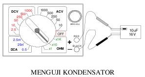 Bila jarum menyimpang ke KANAN dan kemudian secara berangsur-angsur kembali ke KIRI, berarti kondensator baik. Bila jarum tidak bergerak, kondensator putus dan bila jarum mentok ke kanan dan tidak balik, kemungkinan kondensator bocor.