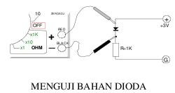 Dengan jangkah VDC, bahan suatu dioda dapat juga diperkirakan dengan circuit pada gambar 10. Bila tegangan katoda anoda 0.2 V, maka kemungkinan dioda germanium, dan bila 0.6V kemungkinan dioda silicon.