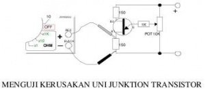 Jangkah pada 10 VDC dan potensio pada minimum, tegangan harus kecil. Setelah potensio diputar pelan-pelan jarum naik sampai posisi tertentu dan kalau diputar terus jarum tetap disitu. Bila jarum diputar pelan-pelan ke arah minimum lagi, pada suatu posisi tertentu tiba-tiba jarum bergerak ke kiri dan bila putaran potensio diteruskan sampai minimum jarum tetap disitu. Bila peristiwa tersebut terjadi, maka UJT masih baik.
