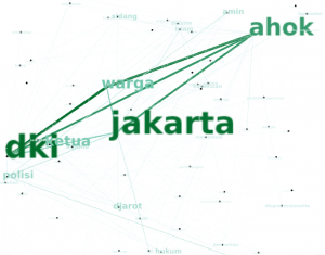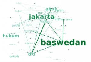 - ENAM. Terakhir kita perlu memvisualisasikannnya dalam bentuk grafik. Ini menggunakan aplikasi gephi yang open source. Disini bisa dimanipulasi sedikit, dalam arti size / besar kata bisa di atur sesuai dengan tingkat penting-nya kata tersebut. Size garis hubungan juga bisa dibuat sesuai dengan tingkat intensitas hubungan yang terjadi. Hasilnya adalah 3 gambar berikut untuk masing-masing CAGUB DKI.