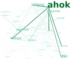Gambar di atas adalah persepsi media online terhadap kata ahok. Ternyata ahok sangat dominan sekali. Yang menarik kata ahok di bayangi oleh kata-kata seperti sidang, agama, islam, umat, menghina, hukum dll ...