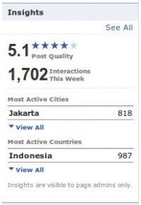 Salah satu fitur yang sangat berguna dari halaman Fans adalah Insights dari sebuah halaman Fans. Insights hanya dapat dilihat oleh owner halaman fans tersebut. Kita dapat melihat kualitas posting, interaksi dengan fans pada minggu tersebut. kota mana yang paling aktif, dan negara mana yang paling aktif berinteraksi. Pada menu “See All” kita dapat melihat dengan lebih detail tentang aktifitas halaman Fans kita.
