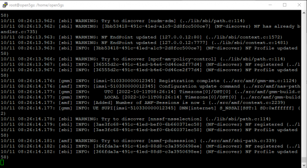 10/11 08:26:13.962: [sbi] WARNING: Try to discover [nudm-sdm] (../lib/sbi/path.c:114) 10/11 08:26:13.962: [sbi] WARNING: [3bb53418-491c-41ed-alc9-2d8fcc500ce7] (NF-discover) NF has already bandler.c:735) 10/11 08:26:13.963: [sbi] WARNING: NF EndPoint updated [127.0.0.12:80] (../lib/sbi/context.c:1572) 10/11 08:26:13.963: [sbi] WARNING: NF EndPoint updated [127.0.0.12:7777] (../lib/sbi/context.c:1481) 10/11 08:26:13.963: [sbi] INFO: [3bb53418-491c-41ed-a1c9-2d8fcc500ce7] (NF-discover) NF Profile updated 58) 10/11 08:26:13.966: [sbi] WARNING: Try to discover [npcf-am-policy-control] (../lib/sbi/path.c:114) 10/11 08:26:13.967: [sbi] INFO: [36555d2c-491c-41ed-b4e6-0d46ce2f77d4] (NF-discover) NF registered (../1 10/11 08:26:13.967: [sbi] INFO: [36555d2c-491c-41ed-b4e6-0d46ce2f77d4] (NF-discover) NF Profile updated 58) 10/11 08:26:14.176: [gmm] INFO: [imsi-510330000012345] Registration complete (../src/amf/gmm-sm.c:1124) 10/11 08:26:14.176: [amf] INFO: [imsi-510330000012345] Configuration update command (../src/amf/nas-path 10/11 08:26:14.177: [gmm] INFO: UTC [2022-10-11T08:26:14] Timezone [0]/DST [0] (../src/amf/gmm-build.c 10/11 08:26:14.177: [gmm] INFO: LOCAL [2022-10-11T08:26:14] Timezone [0] /DST [0] (../src/amf/gmm-build 10/11 08:26:14.177: [amf] INFO: [Added] Number of AMF-Sessions is now 1 (../src/amf/context.c:2239) 10/11 08:26:14.177: [gmm] INFO: UE SUPI [imsi-510330000012345] DNN [internet] S_NSSAI[SST:1 SD:0xffffff] ( 2) 10/11 08:26:14.178: [sbi] WARNING: Try to discover [nnssf-nsselection] (../lib/sbi/path.c:114) 10/11 08:26:14.179: [sbi] INFO: [3ae3fc68-491c-41ed-bef0-6b660371ec58] (NF-discover) NF registered (../1 10/11 08:26:14.179: [sbi] INFO: [3ae3fc68-491c-41ed-bef0-6b660371ec58] (NF-discover) NF Profile updated 58) 10/11 08:26:14.181: [amf] WARNING: Try to discover [nsmf-pdusession] (../src/amf/sbi-path.c:339) 10/11 08:26:14.182: [sbi] INFO: [366fda3a-491c-41ed-88d8-c3a3950698ee] (NF-discover) NF registered (../1 10/11 08:26:14.182: [sbi] INFO: [366fda3a-491c-41ed-88d8-c3a3950698ee] (NF-discover) NF Profile updated 58)