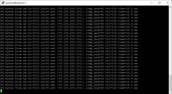root@srsran:/usr/local/src/srsRAN/srsue# ping google.com 64 bytes from sa-in-f101.1e100.net (74.125.200.101): icmp_seq=40 ttl=102 time=15.2 ms 64 bytes from sa-in-f101.1e100.net (74.125.200.101): icmp_seq=41 ttl=102 time=15.2 ms 64 bytes from sa-in-f101.1e100.net (74.125.200.101): icmp_seq=42 ttl=102 time=15.6 ms 64 bytes from sa-in-f101.1e100.net (74.125.200.101): icmp_seq=43 ttl=102 time=15.4 ms 64 bytes from sa-in-f101.1e100.net (74.125.200.101): icmp_seq=44 ttl=102 time=15.4 ms 64 bytes from sa-in-f101.1e100.net (74.125.200.101): icmp_seq=45 ttl=102 time=15.2 ms 64 bytes from sa-in-f101.1e100.net (74.125.200.101): icmp_seq=46 ttl=102 time=15.7 ms 64 bytes from sa-in-f101.1e100.net (74.125.200.101): icmp_seq=47 ttl=102 time=15.4 ms 64 bytes from sa-in-f101.1e100.net (74.125.200.101): icmp_seq=48 ttl=102 time=15.5 ms 64 bytes from sa-in-f101.1e100.net (74.125.200.101): icmp_seq=49 ttl=102 time=15.4 ms 64 bytes from sa-in-f101.1e100.net (74.125.200.101): icmp_seq=50 ttl=102 time=15.2 ms 64 bytes from sa-in-f101.1e100.net (74.125.200.101): icmp_seq=51 ttl=102 time=15.2 ms 64 bytes from sa-in-f101.1e100.net (74.125.200.101): icmp_seq=52 ttl=102 time=15.8 ms 64 bytes from sa-in-f101.1e100.net (74.125.200.101): icmp_seq=53 ttl=102 time=15.5 ms 64 bytes from sa-in-f101.1e100.net (74.125.200.101): icmp_seq=54 ttl=102 time=15.5 ms 64 bytes from sa-in-f101.1e100.net (74.125.200.101): icmp_seq=55 ttl=102 time=15.1 ms 64 bytes from sa-in-f101.1e100.net (74.125.200.101): icmp_seq=56 ttl=102 time=15.8 ms 64 bytes from sa-in-f101.1e100.net (74.125.200.101): icmp_seq=57 ttl=102 time=15.4 ms 64 bytes from sa-in-f101.1e100.net (74.125.200.101): icmp_seq=58 ttl=102 time=15.2 ms 64 bytes from sa-in-f101.1e100.net (74.125.200.101): icmp_seq=59 ttl=102 time=15.2 ms 64 bytes from sa-in-f101.1e100.net (74.125.200.101): icmp_seq=60 ttl=102 time=15.4 ms 64 bytes from sa-in-f101.1e100.net (74.125.200.101): icmp_seq=61 ttl=102 time=15.2 ms 64 bytes from sa-in-f101.1e100.net (74.125.200.101): icmp_seq=62 ttl=102 time=15.4 ms 64 bytes from sa-in-f101.1e100.net (74.125.200.101): icmp_seq=63 ttl=102 time=15.4 ms 64 bytes from sa-in-f101.1e100.net (74.125.200.101): icmp_seq=64 ttl=102 time=15.2 ms 64 bytes from sa-in-f101.1e100.net (74.125.200.101): icmp_seq=65 ttl=102 time=16.1 ms 64 bytes from sa-in-f101.1e100.net (74.125.200.101): icmp_seq=66 ttl=102 time=15.0 ms