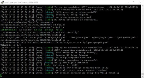 [2022-10-11 08:17:30.210] [sctp] [info] Trying to establish SCTP connection... (192.168.100.238:38412) [2022-10-11 08:17:30.215] [sctp] [info] SCTP connection established (192.168.100.238:38412) [2022-10-11 08:17:30.216] [sctp] [debug] SCTP association setup ascId[6] [2022-10-11 08:17:30.216] [ngap] [debug] Sending NG Setup Request [2022-10-11 08:17:30.233] [ngap] [debug] NG Setup Response received [2022-10-11 08:17:30.233] [ngap] [info] NG Setup procedure is successful ^C root@ueransim: /usr/local/src/UERANSIM root@ueransim: /usr/local/src/UERANSIM# cd build/ root@ueransim: /usr/local/src/UERANSIM/build# ls libdevbnd.so nr-gnb nr-ue nr-binder nr-cli root@ueransim: /usr/local/src/UERANSIM/build# cd ../config/ root@ueransim: /usr/local/src/UERANSIM/config# ls custom-gnb.yaml custom-ue.yaml free5gc-gnb.yaml free5gc-ue.yaml open5gs-gnb.yaml open5gs-ue.yaml root@ueransim: /usr/local/src/UERANSIM/config# cd .. root@ueransim:/usr/local/src/UERANSIM# ./build/nr-gnb -c config/open5gs-gnb.yaml UERANSIM v3.2.6 [2022-10-11 08:19:37.195] [sctp] [info] Trying to establish SCTP connection... (192.168.100.238:38412) [2022-10-11 08:19:37.199] [sctp] [info] SCTP connection established (192.168.100.238:38412) [2022-10-11 08:19:37.199] [sctp] [debug] SCTP association setup ascId[7] [2022-10-11 08:19:37.200] [ngap] [debug] Sending NG Setup Request [2022-10-11 08:19:37.200] [ngap] [debug] NG Setup Response received [2022-10-11 08:19:37.200] [ngap] [info] NG Setup procedure is successful [2022-10-11 08:26:11.394] [rrc] [debug] UE [1] new signal detected [2022-10-11 08:26:13.895] [rrc] [info] RRC Setup for UE [1] [2022-10-11 08:26:13.895] [ngap] [debug] Initial NAS message received from UE [1] [2022-10-11 08:26:13.937] [ngap] [debug] Initial Context Setup Request received [2022-10-11 08:26:14.165] [ngap] [info] PDU session resource (s) setup for UE [1] count [1]