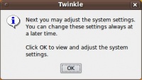 Konfigurasi system biasanya semua akan di deteksi secara automatis oleh twinkle dan tidak perlu di ubah. Walaupun demikian twinkle biasanya akan menawarkan konfigurasi system untuk di lihat.