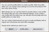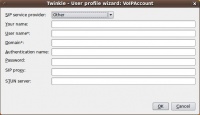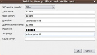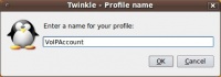 Saat pertama kali twinkle di jalankan maka akan di tawarkan untuk membuat user profile untuk account VoIP. Tekan tombol OK untuk meng-iya-kan.